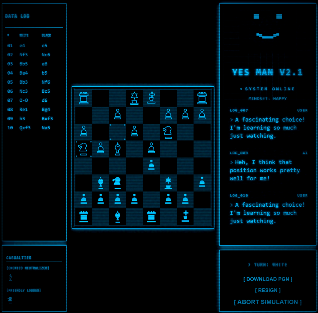 **Play chess against Fallout: New Vegas's Yes Man in a retro-futuristic terminal!**